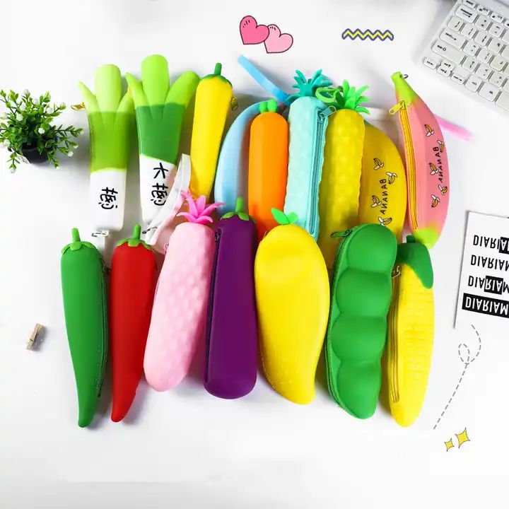 新款可愛(ài)卡通卡哇伊蔬菜便攜式硅筆筆袋化妝化妝口袋學(xué)校固定盒